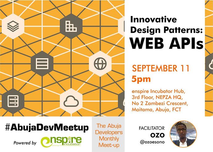As a result of the remarkable success of the first edition of the #AbujaDevMeetup and as agreed in the previous meeting we have decided to organize the second edition of Abuja Developer Community Monthly Meetup discussing Web API as a trending design pattern. Let’s exchange ideas, initiatives, showcase and hack around different possibilities with Web APIs. Follow the Conversation with #WebAPI #AbujaDevMeetup