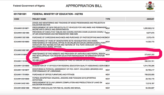 Misleading title… Budget says: Maintenance of FME Website and Provision of Antivirus and Portal Design and Development for Nigeria Education Management Information System (NEMIS)